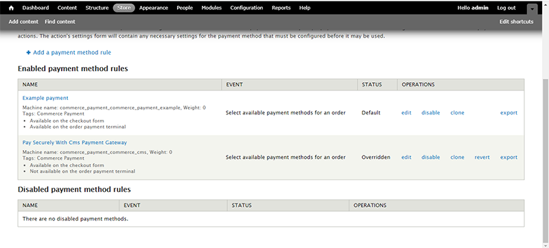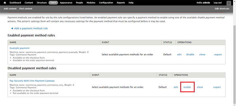 Again goto Store => Configuration => Payment Methods. In "Payment methods" page, go to "Disabled payment method rules" and find "Pay securely with Cms Payment Gateway" link and click on "enable".
