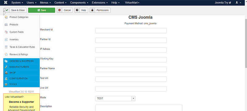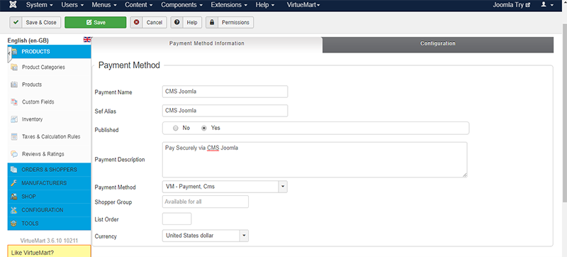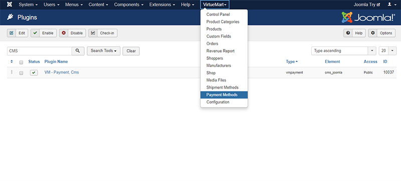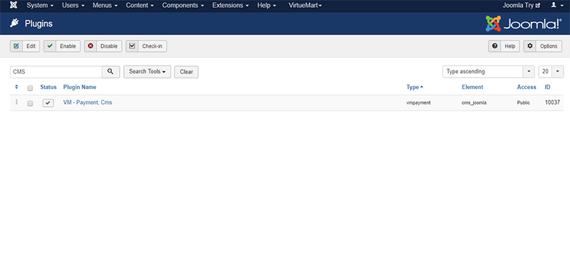 - Go to Extensions=>plugins and enable the "VM-Payment, Cms".