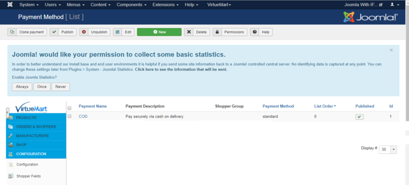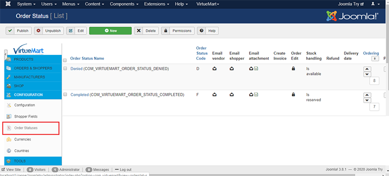 - Goto VirtueMart->Configuration->Order Statuses on left as shown in the figure and click on "new" button