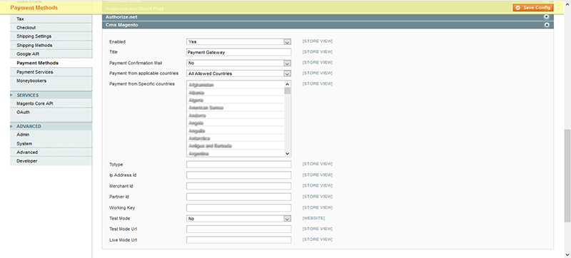 Log into magento admin panel and go to System=>Configuration=>Payment Methods and find the name of the plugin and configure the plugin as provided by payment gateway and click to save. See the below screenshot for reference. [Make sure that Cache Storage Management is disabled if not, go to System=>cache management, select all checkbox on left side and from Actions dropdown select disable on right side and click submit button.]