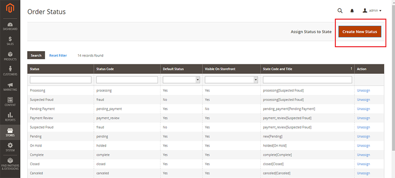 - Goto Admin->Stores->Order Status and click on Create New Status