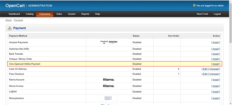 Now in menu bar goto Extensions=>Payments, now you will get to see screenshot like below. Locate the “CMS Opencart Online Payment” and click on “install” link/button