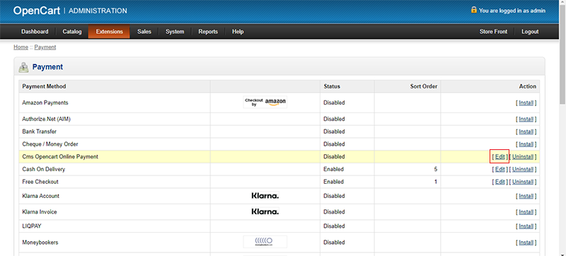 After installing you need to click on “Edit” link/button to configure the CMS Opencart gateway settings. See the below screenshot for your reference