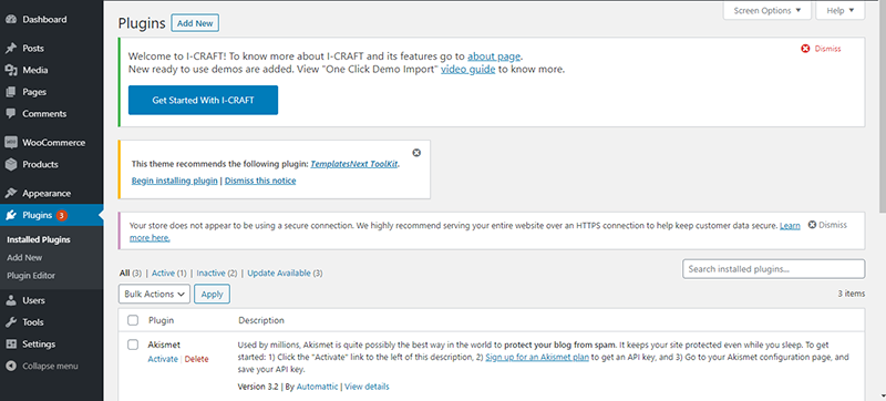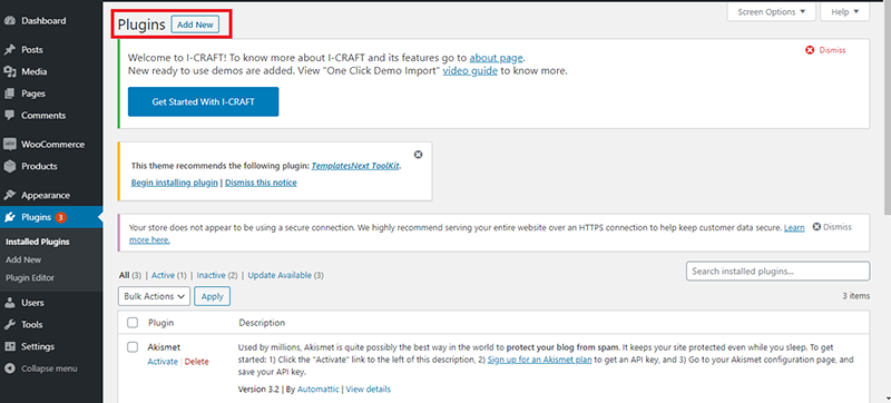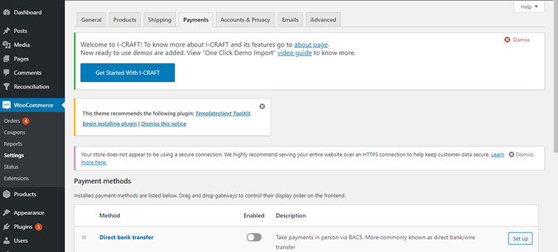 - After activating the plugin, the following screen will be displayed (Figure 7). Click the "WooCommerce -> Settings" link from the left side navigation panel.