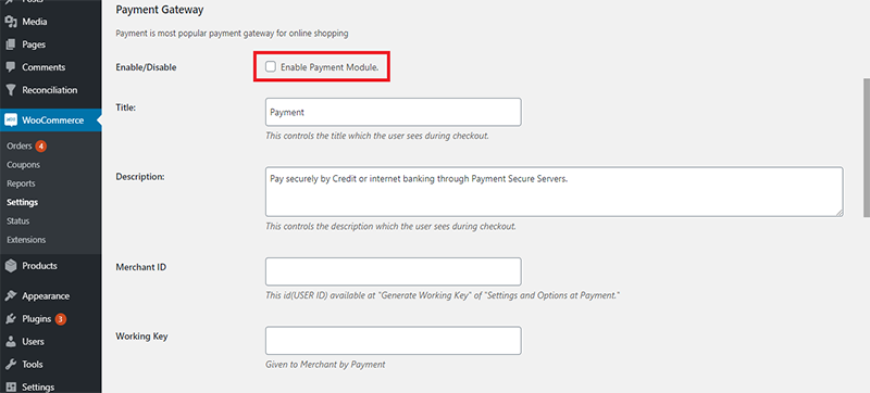 - In the following page (Figure 10), please tick on "Enable pz-woocommerce Payment Module" link. Also fill all the technical details received from and click on "Save Changes" on the bottom of the page (Figure 11).