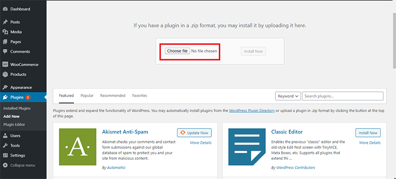 - After clicking on a "Choose File" button, a small search dialog box will be displayed, now search for the zip file (plugin provided by as pz-woocommerce) and the click on "Open".