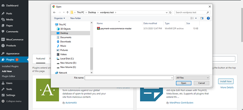 - After clicking on a "Choose File" button, a small search dialog box will be displayed, now search for the zip file (plugin provided by as payment-woocommerce-master) and the click on "Open".