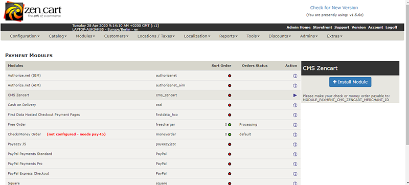 Goto tab Modules=>Payment and locate CMS Zencart as shown in the below screenshot, Now click install button to install CMS Zencart Online Payment.