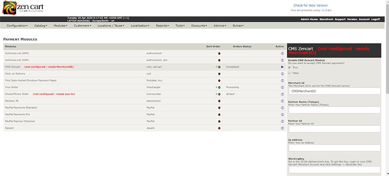 Select Payment Method as “CMS Zencart” and click on the “Continue” button.
