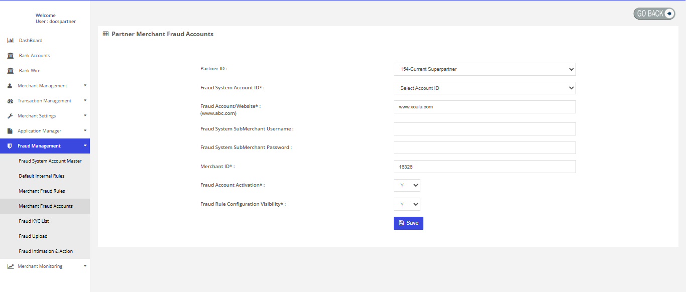 Here you can add new partner merchant fraud account.