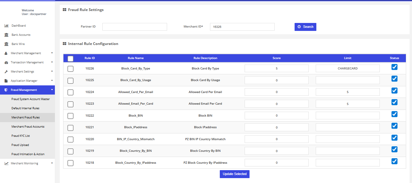 After login you need to click on "Default Internal Rules" section under "Fraud Management" tab in the left navigation panel of Partner's back office.