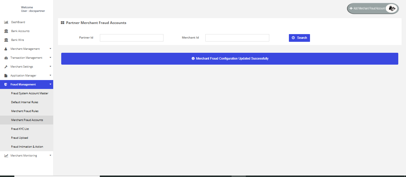 After login you need to click on "Fraud System Account Master" section under "Fraud Management" tab in the left navigation pannel of Partner's back office.