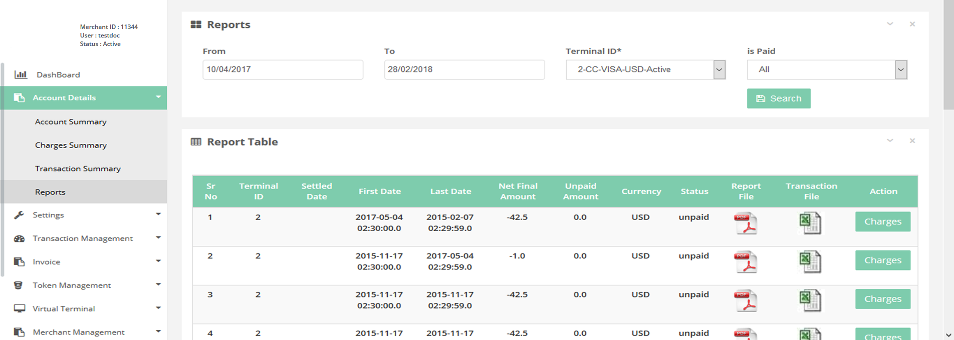 In this page you can see the charges summary per terminal basis.