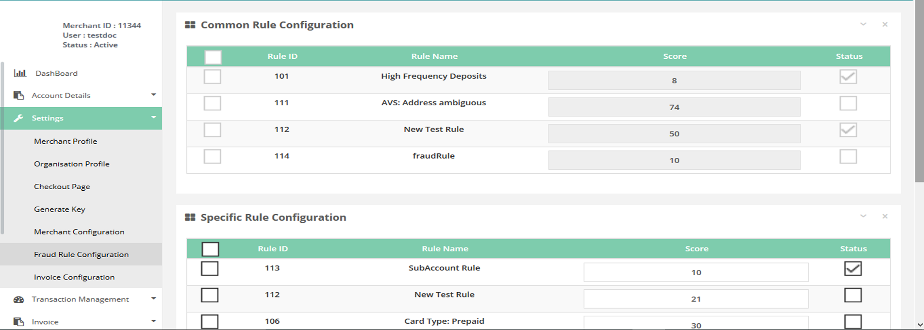 After login you need to click on "Fraud Rule Configuration" section under "Settings".