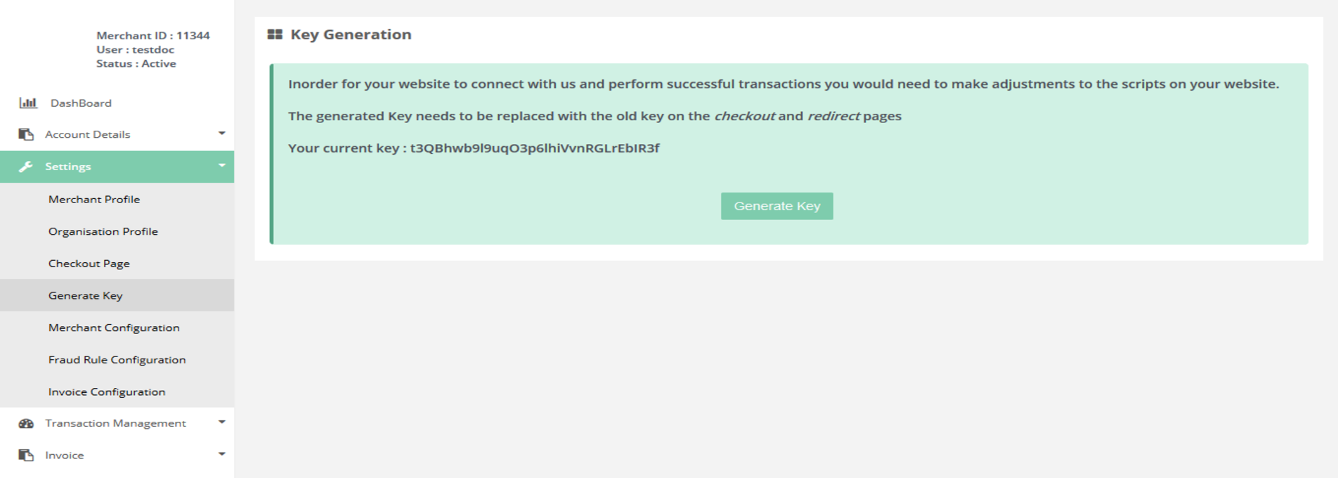 After login you need to click on Generate Key section under Settings tab in the left navigation bar of Merchant’s back office.
