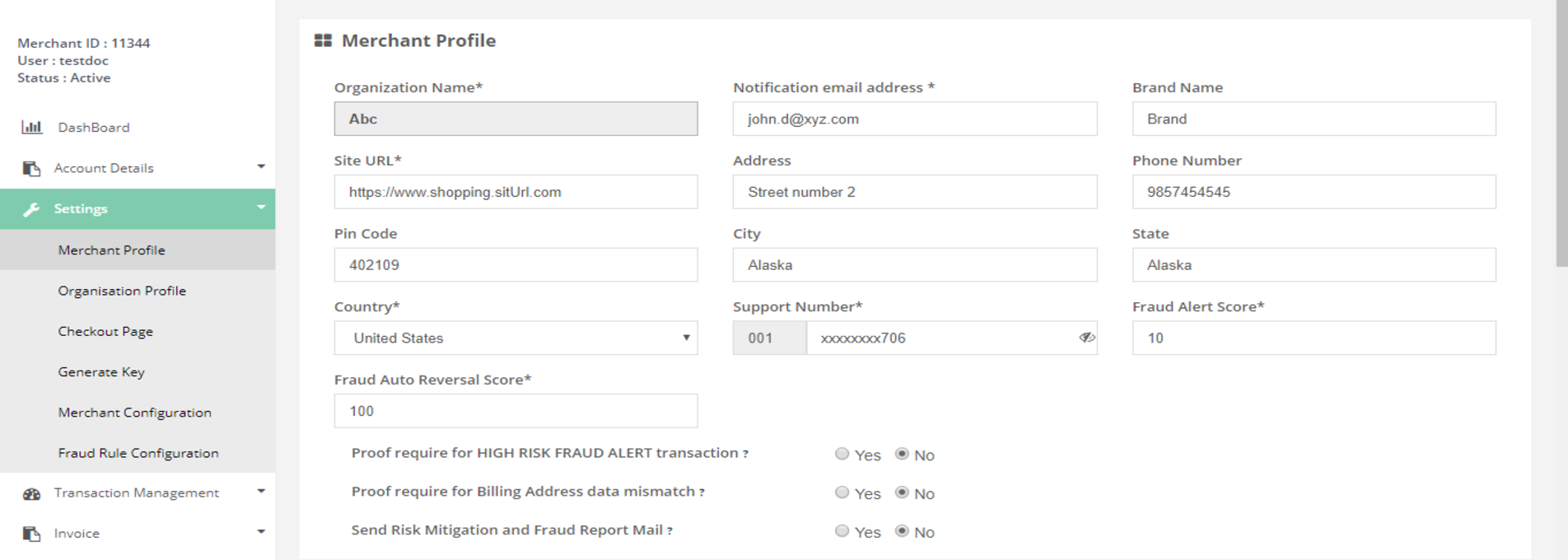 After login you need to click on Organisation Profile section under Settings tab in the left navigation bar of Merchant’s back office.