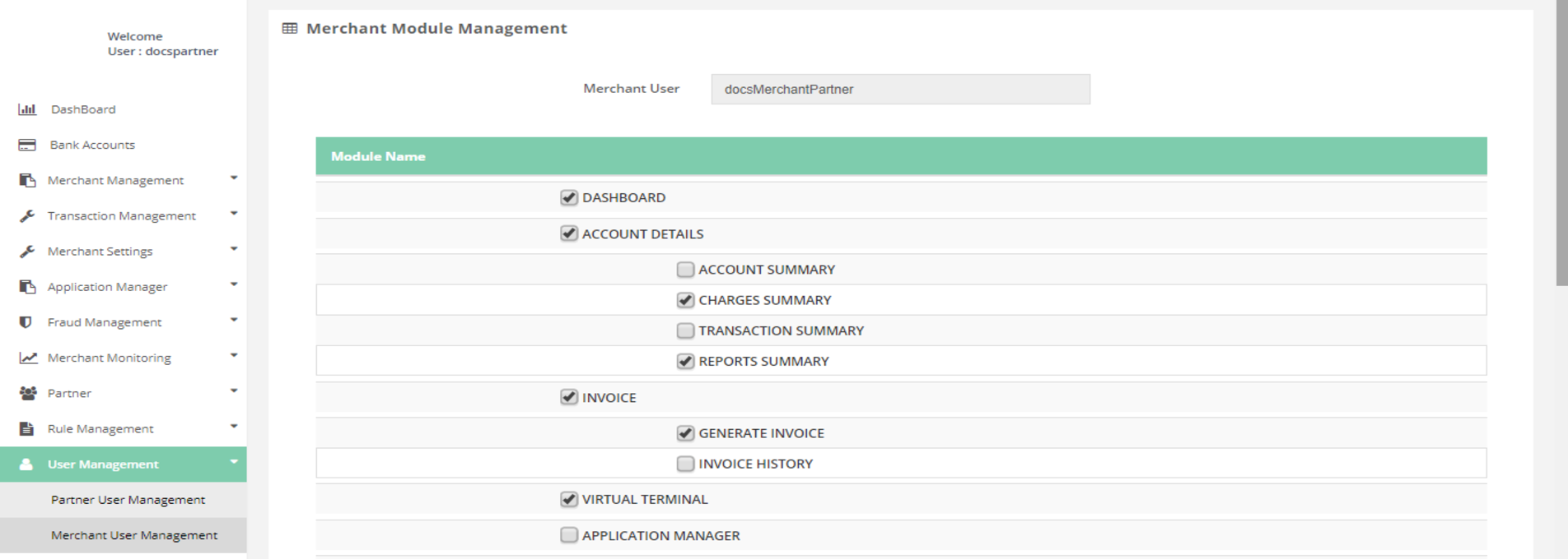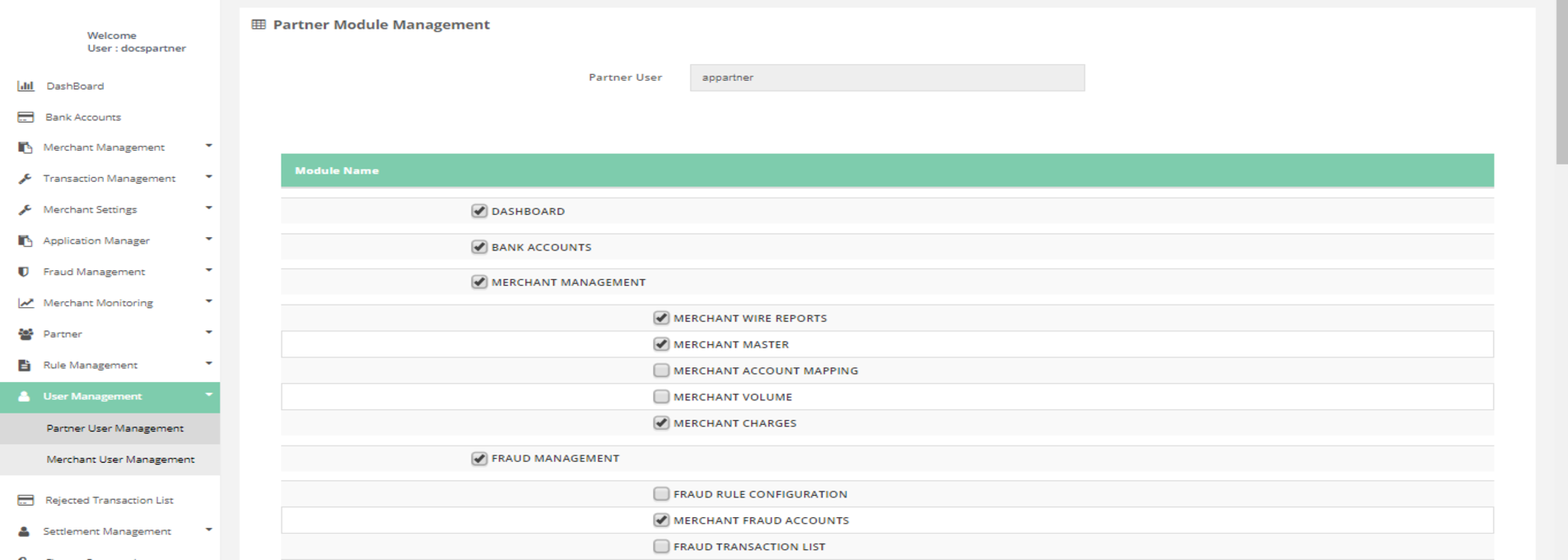 To allocate module to partner user go to the "Partner User Management" section under "User Management" tab. Then you have to click on search to get the list of users which allows you to allocate modules to the user details by clicking on "Module Allocation" button.