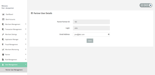 After Login, you need to click on the User Management section in the left navigation panel of Partner's back office. Then you have to click on search to get the list of users which allows you to "View" the user details by clicking on "View" button.
